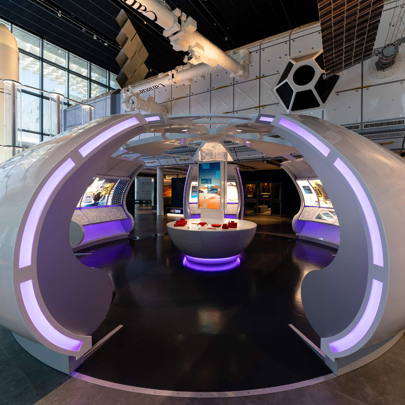 View the video"Land a Spacecraft!" is an educational, arcade-style interactive that allows users to experience the challenges of atmospheric re-entry and spacecraft landing. This bilingual exhibit teaches visitors the science behind spacecraft design, velocity management, and landing procedures through a sequence of decision-based mini-games.