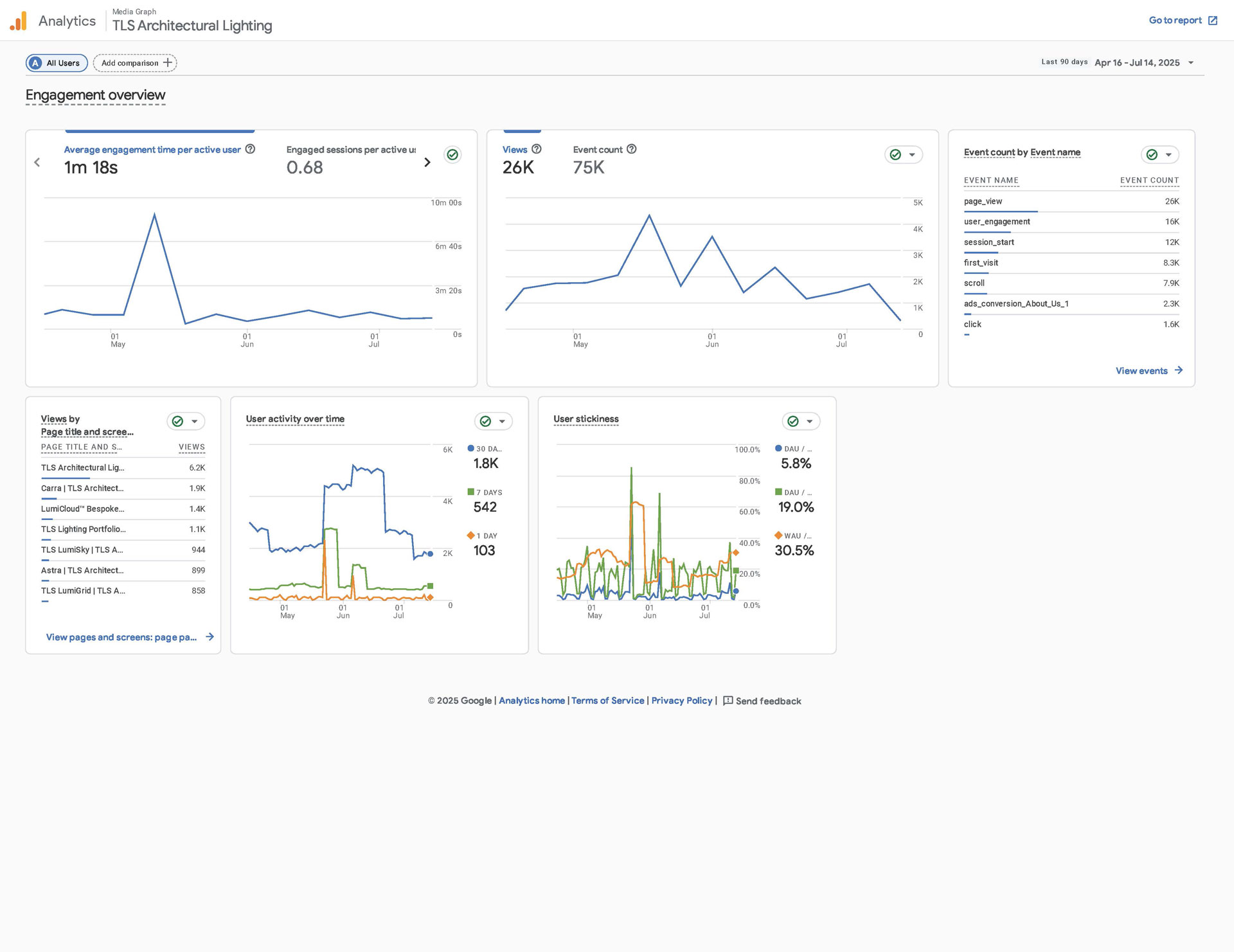According to Google Analytics (Apr 16 – Jul 14, 2025), the redesigned TLS website recorded 26,000 total views and 75,000 tracked events, with an average engagement time of 1 minute and 18 seconds per user. Pages like the Carra product detail and LumiCloud™ Bespoke saw the highest traffic, reflecting interest in clearly structured product collections. These analytics confirm that the redesigned layout, especially the navigation improvements, effectively supported user needs and retained attention across sessions.
