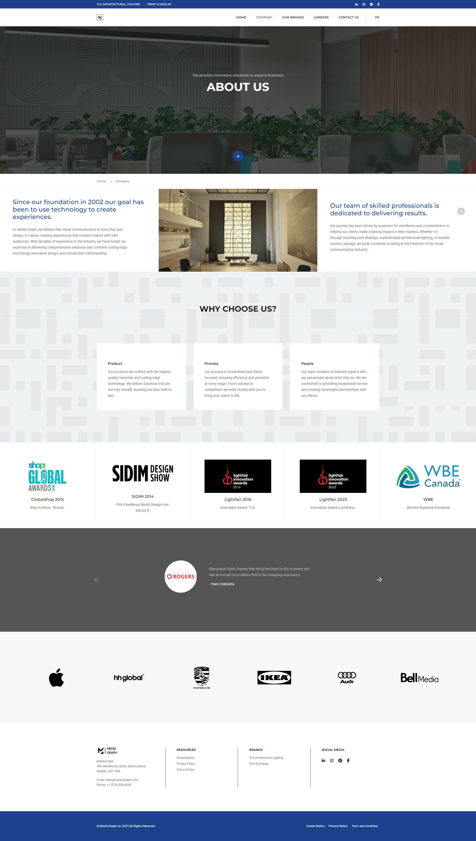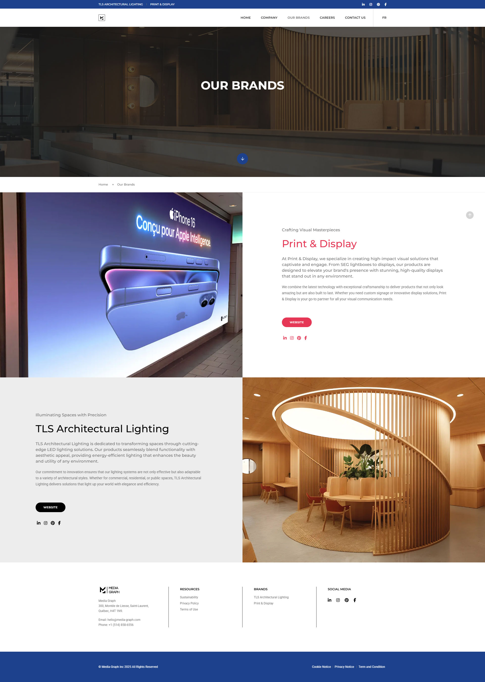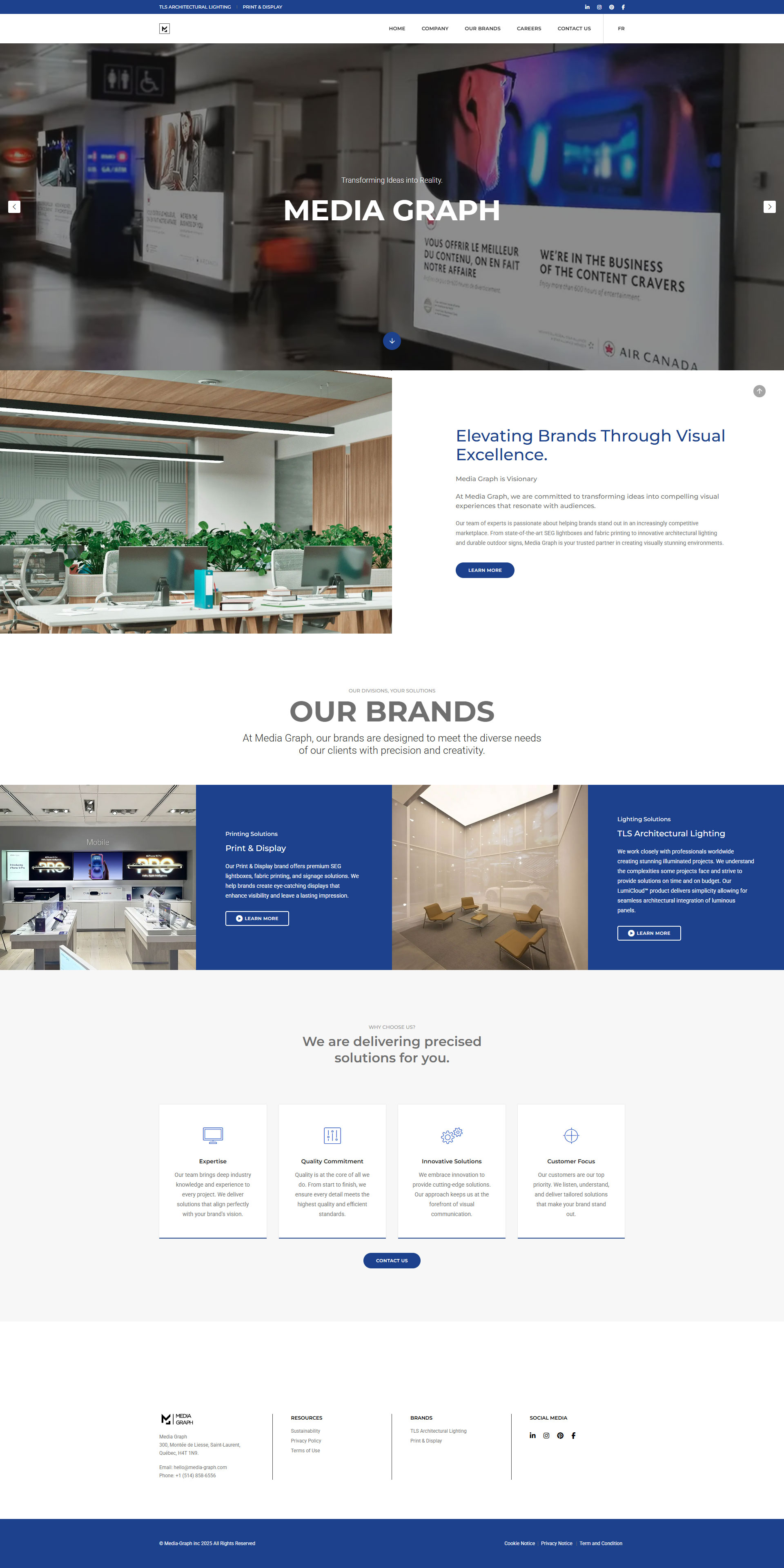 Media-Graph is a company that specializes in advertising printing and architectural Lighting. It is divided into two brands: Print & Display and TLS Architectural Lighting. Here we can focus on the work I did to redesign and develop their websites for Media-Graph and TLS Architectural Lighting. While Media-Graph's site is already live, TLS Architectural Lighting's site is currently under development and will be launched soon.